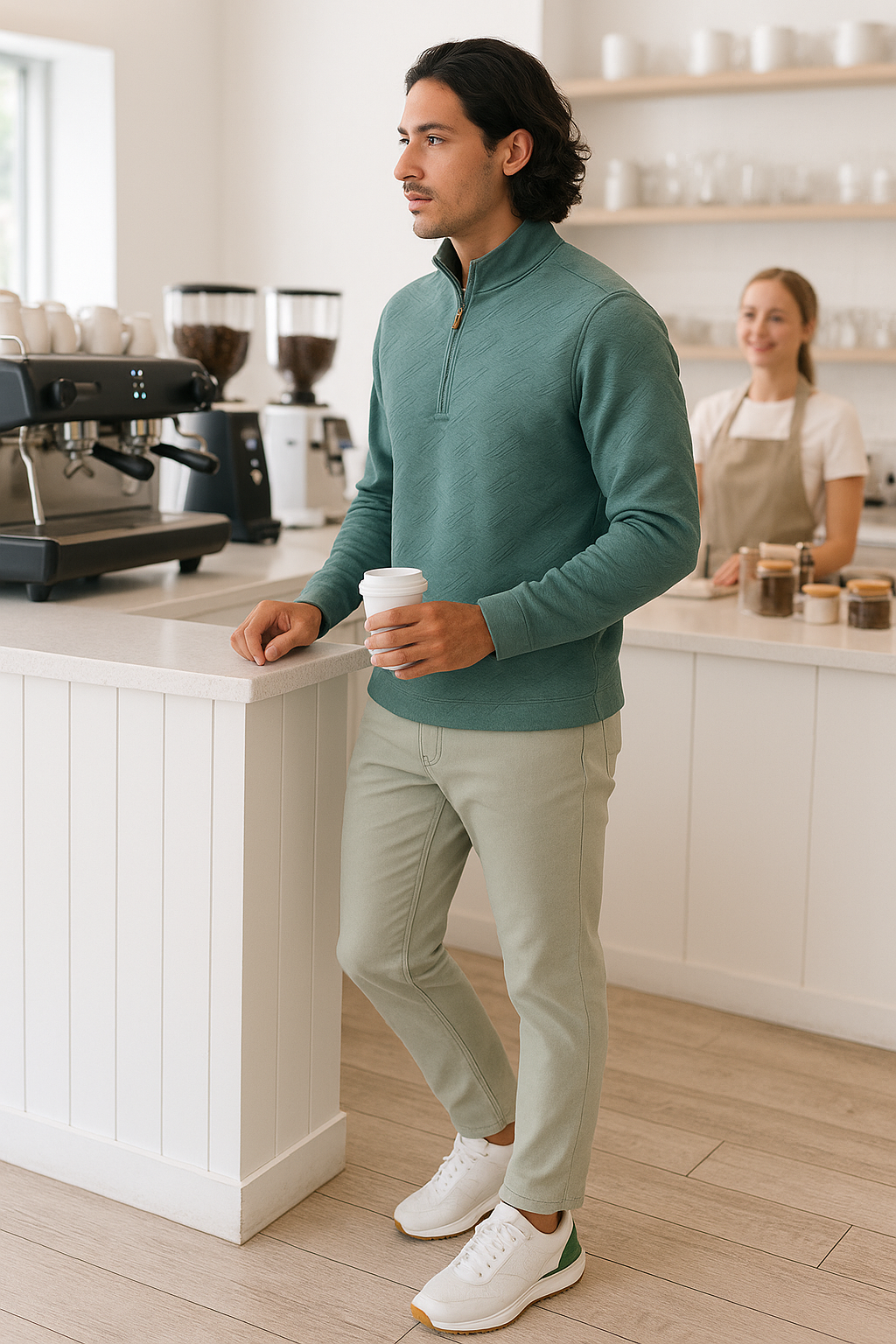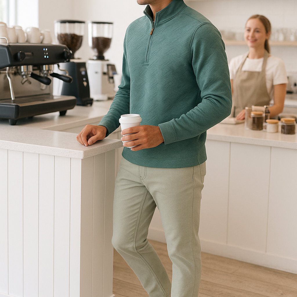 - Subtle piping details at the collar and sleeve seams
